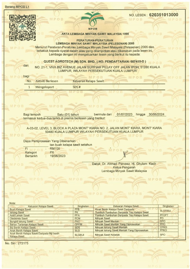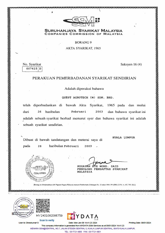 At Quest Agrotech (M) Sdn Bhd, we uphold the highest industry standards through our certifications and strict compliance with regulatory frameworks. Our adherence to global best practices ensures the quality, safety, and sustainability of our products and operations, reinforcing trust and excellence in every aspect of our business.